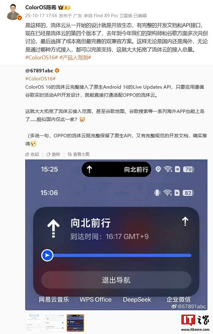 IT之家 10 月 17 日消息,据博主 @67891abc 今日分享,OPPO ColorOS 16 的流体云完整接入了原生 Android 16 的 Live Updates API,只要应用遵循谷歌实时活动 API 开发设计规范,就能直接打通适配 OPPO 的流体云。